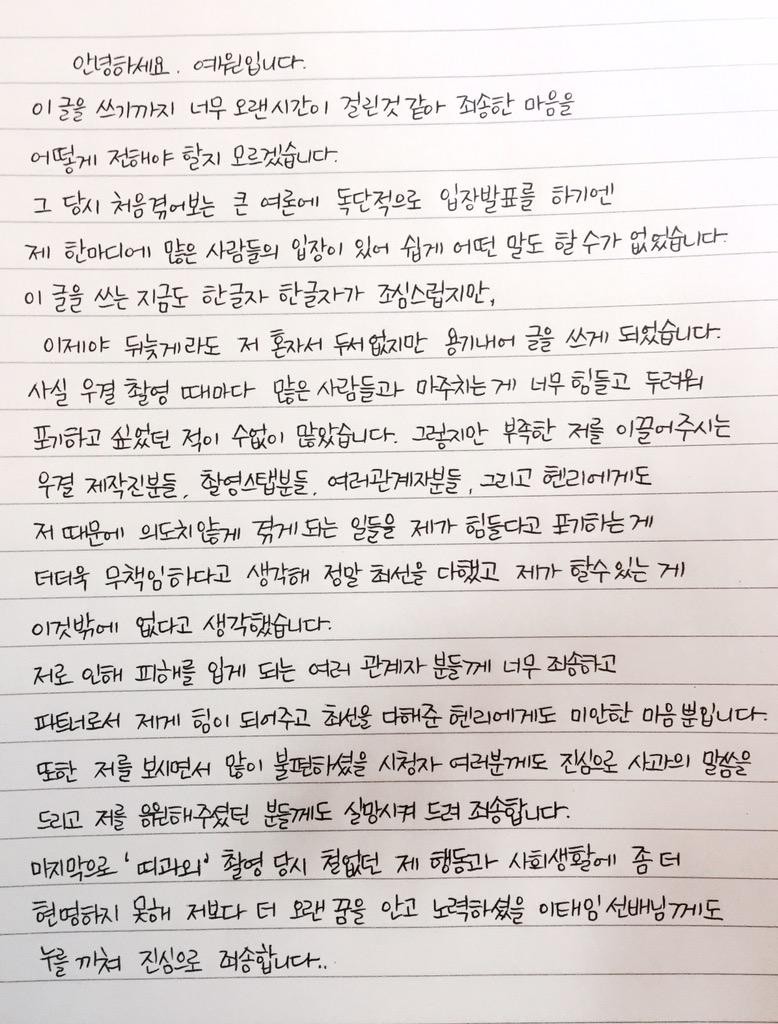 | Subject | 매우 늦은감은 있는 김예원 사과문.tweet |