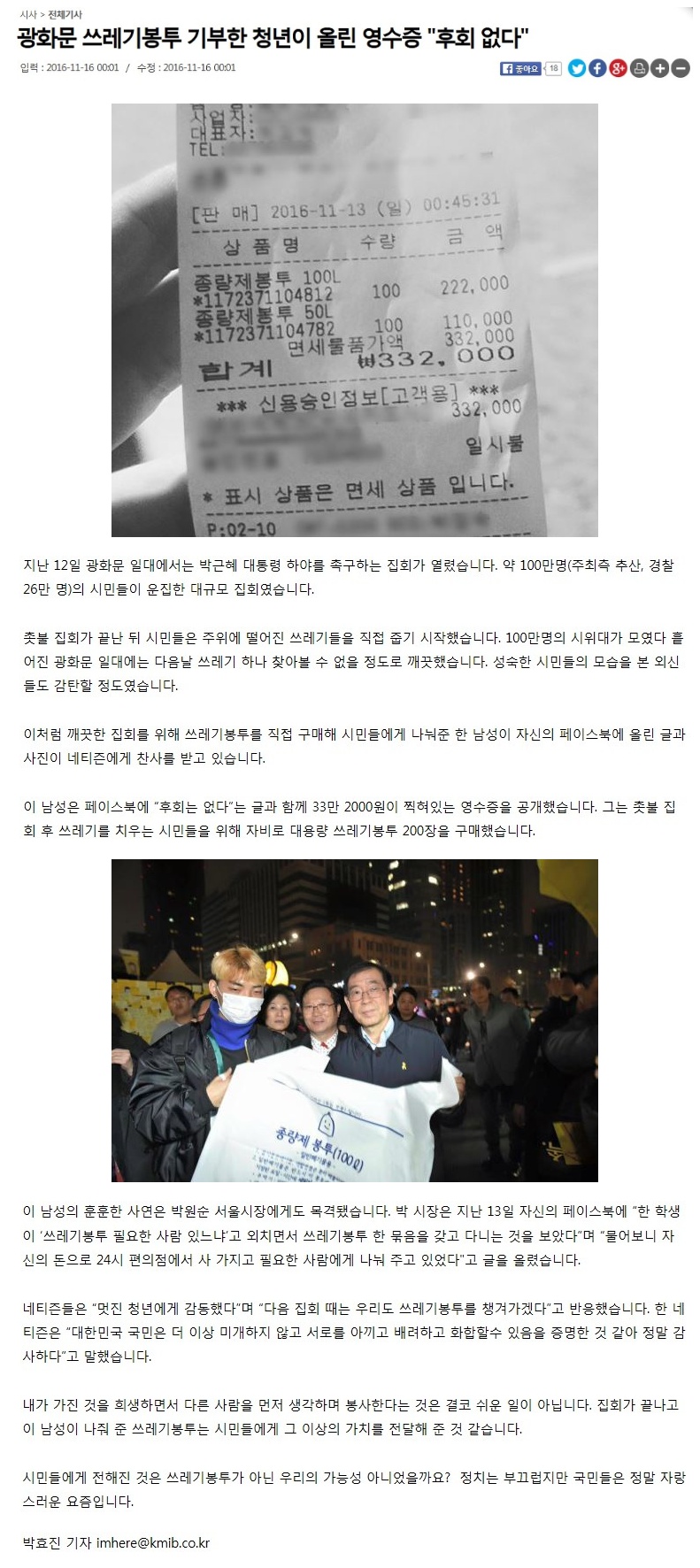 | Subject | 광화문 쓰레기봉투 기부한 청년이 올린 영수증 "후회 없다".jpg |