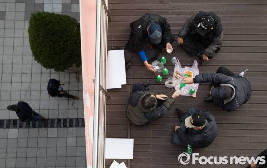 불량 알바들이 업무시간 일은 안하고 옥상에 몰래 짱박혀 술마시고 농땡이 치는 모습이다. 참고로 집회와 무관한 노인분들이 아니라 박사모 집회 참여자들이랍니다. 옆에 치워논 하얀 종이와 6시 할아버지가 끼고 계시는 게 오늘 박사모의 집회 피켓이고 시간은 한참 집회가 진행되던 낮시간이었구요. 0