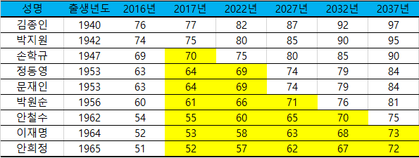 대통령이라는 무게를 생각했을 때 자신의 건강은 국가의 안위에 직결되는 것으로 직무를 수행하기에 무리없는 나이 또한 중요할 것입니다. 그래서 공정함이나 객관성은 1그람도~~~ 없는 순도 100프로 내맘대로 기준을 만들어 보았습니다. 고 김대중 전대통령이 1924년생으로 1997년 대선 당시 만 73세이었습니다. 고 김대중 전대통령은 자신의 역할을 충분히 해내셨다는 점을 고려하여 대권도전 커트라인을 73세로 잡아보았습니다. 제 맘대로 선정한 야권후보들을 현 5년 단임제 대통령제가 유지된다는 가정하에 과연 몇년간 몇번이나 도전 가능한지 알아봤습니다. 정동영씨가 생각보다 젊더라구요. 잊어버리고 있었는데 2007년 당시 50대로 젊은 나이였다는 걸 까묵었나 봅니다. 손학규 : 2017년 1회 정동영, 문재인 : 2022년까지 2회 박원순 : 2027년까지 3회 안철수 : 2032년까지 4회 이재명, 안희정 : 2037년까지 5회 말년병장 심정이라 심심해서 여기저기 돌아댕기다가 문득 내년 대선이 생각이 나 한번 해봤습니다. 1