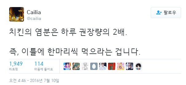 | Subject | 치킨의 염분은 하루 권장량의 2배 |