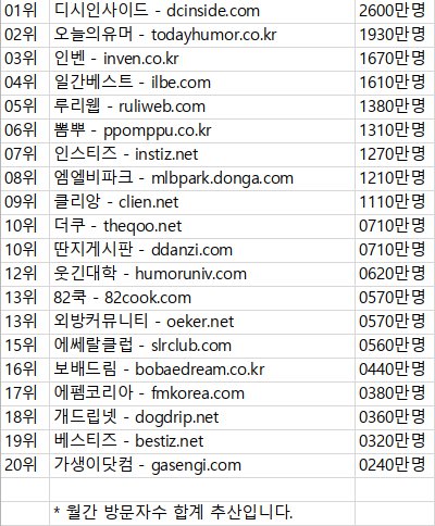 | Subject | 커뮤니티 월간 방문자수 |