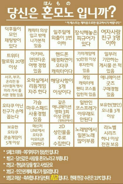 전 5개군요 덕후들이 모인 채팅방이 있다 ㅡ> 그렇긴 한데 대부분 휴덕해서 오덕 얘기 안함 여자사람 친구 3명 이하 ㅡ> 30대면 많이들 그렇지 않나요? 해당 사항이 3개 이상 ㅡ> ... 메신저 라인에서 오타쿠 이모티콘 구매했다 ㅡ> 광고보고 예전에 모은걸로 산 거 있음 2D성인물을 주로 수집한다 ㅡ> 주로까진 아니지만... 이상 변명목록.txt 사실 리듬게임 한다고 오덕, 일본노래 부른다고 오덕은 좀 이상하군요 애니송도 아니고 일본노래라니! ㅠㅡㅠ 0