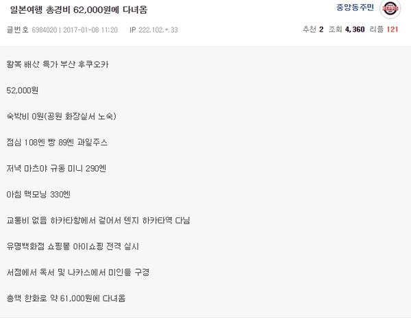 | Subject | 일본 여행 총 경비 6만2천원 |