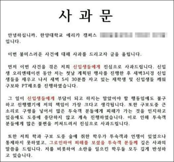 사과문은 자신의 잘못을 솔직히 인정하는데서 시작한다고 생각합니다. 그런데 투숙객에게 욕설, 협박한 일은 쏙 빼먹고 단순히 언쟁이 있었다라고 쌍방과실로 몰아가는 늬앙스가 보통이 아닌게 정치인의 자질이 보이네요. 크게 될 인물입니다. 게다가 사과문의 대부분은 신입생과 재학생에 전면에 할애하고 직접적인 피해를 입은 투숙객들에게는 짧게 후반부에 코멘트하는 치밀함도 대단하네요. 똑똑해요. 0