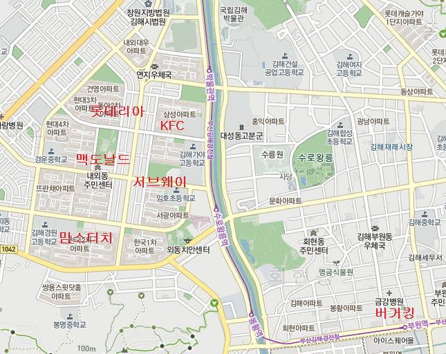 경남 김해시 내외동. 없는데는 없다는 버거킹, 서브웨이부터 맥날, 맘스터치까지 다 있음. 단, 파파이스는 없음. 0