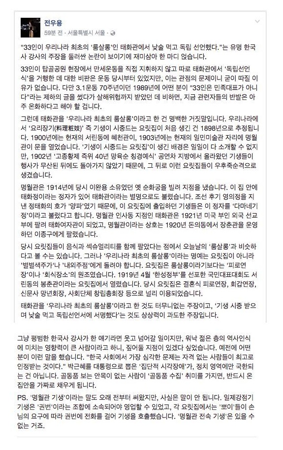 설민석 논란에 대한 전우용 역사학자 페북 0