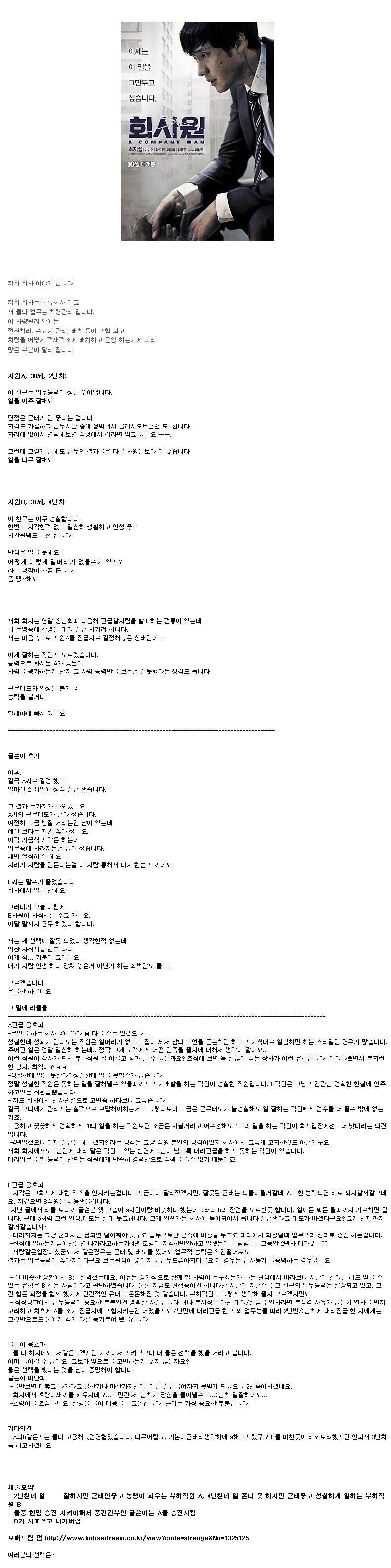 개인적으로 B에게 성실하다고 붙일 수 있는지도 의문이지만, 일하고 그 성과를 발휘하는게 목적인 회사에서 A의 근태를 문제삼는 이유를 잘 모르겠습니다. 제가 사회생활을 잘 못 한건지... 옆동네에선 A의 근태가 문제가 많다는 댓글들이 많아서 홍차넷에서도 한 번 의견 들어보고 싶어서 가져왔습니다. 0