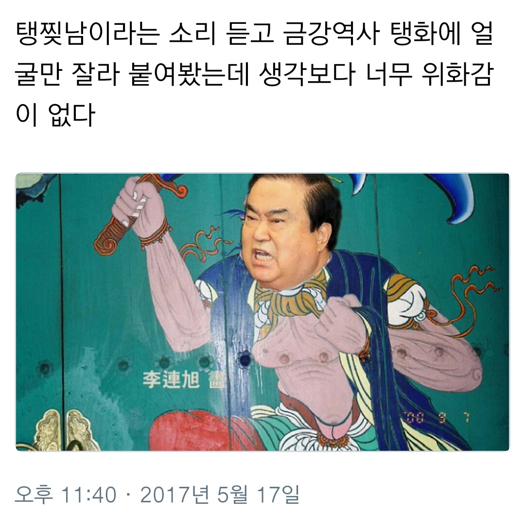 탱찢남 - 탱화 찢고 나온 남자 (탱화 : 불교 그림) 자매품 : 문희상 특사, 아베 면담..일본 반응 "협상 한다더니 오야붕 왔다" http://v.media.daum.net/v/20170518171604816 트위터 출처 : https://mobile.twitter.com/s_r_b_b/status/864853047352016897 0