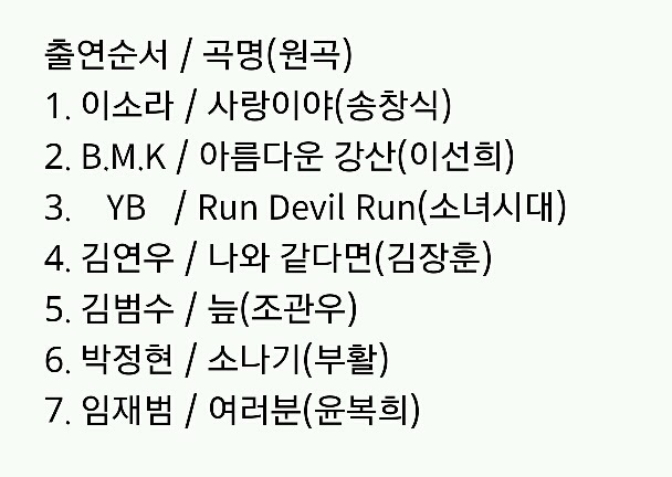 1. 이소라 - 사랑이야 2. BMK - 아름다운 강산 3. YB - run devil run 4. 김연우 - 나와 같다면 5. 김범수 - 늪 6. 박정현 - 소나기 7. 임재범 - 여러분 7곡 모두 나가수 역사에서 전설의 레전드급이라 하겠습니다. 이게 벌써 6년전이군요. 0