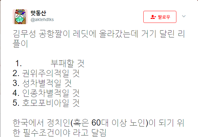 | Subject | [블랙유머] 한국에서 정치인(혹은 60대 이상 노인)이 되기 위한 필수조건 |