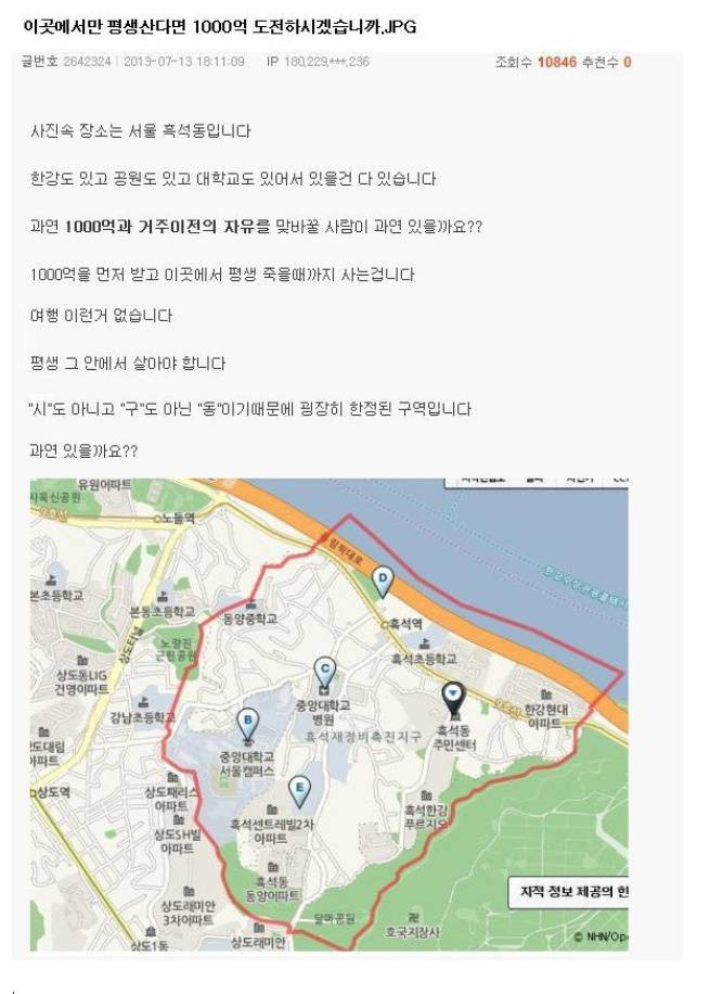 | Subject | 1000억 받는 대신 동네에서만 살기 |