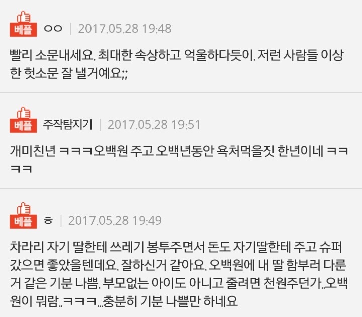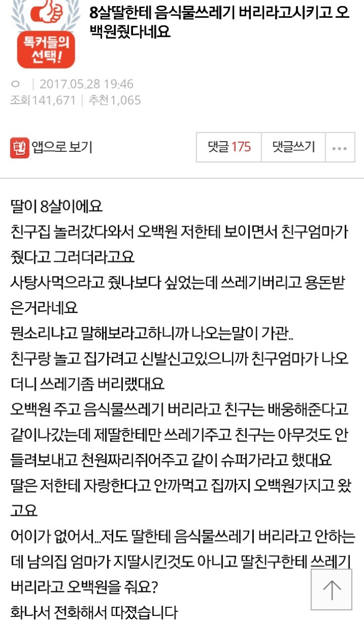 | Subject | 8살 딸한테 음식물 쓰레기 버리라고 시키고 오백원 줬다네요 |
