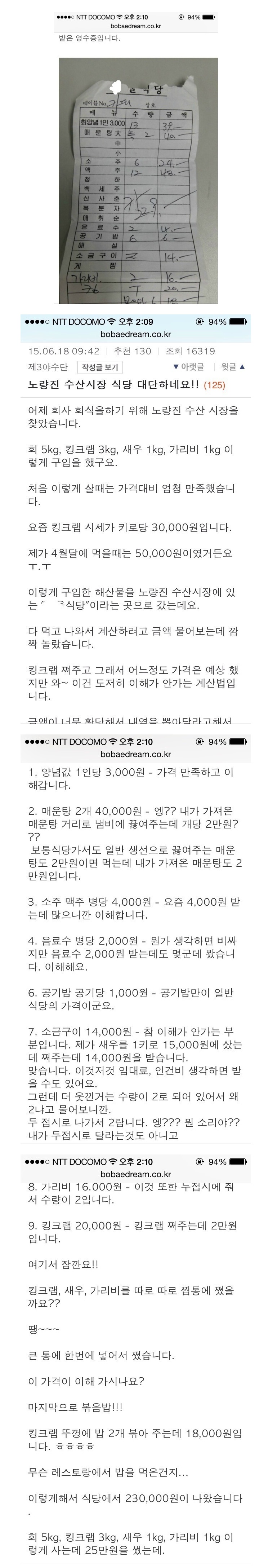 | Subject | 타커뮤니티에서 난리났던 노량진 수산시장 영수증.jpg |