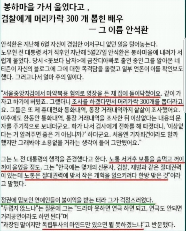 Subject   봉하마을가서 울었다고 머리카락 300개 뽑힌 배우