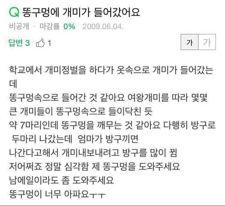 | Subject | X꼬에 개미가 들어갔어요ㅠㅠ |
