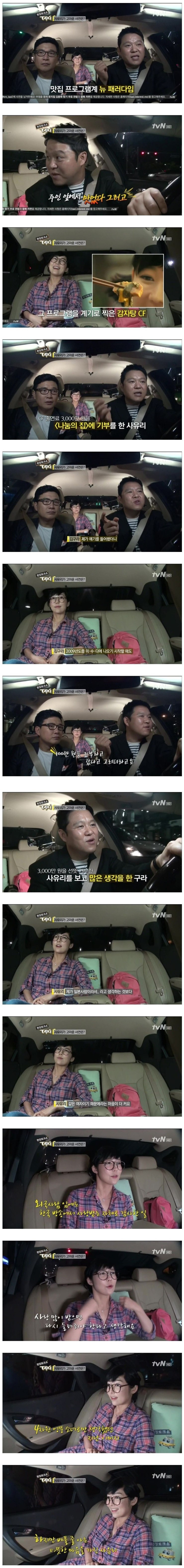 3줄 요약 1. 사유리가 감자탕 CF를 찍음 2. CF로 받은 3천만원을 위안부 할머니들을 위해 나눔의 집에 기부 3. 일본인이라서가 아니라 같은 여자로서 마음이 아팠다고함 1