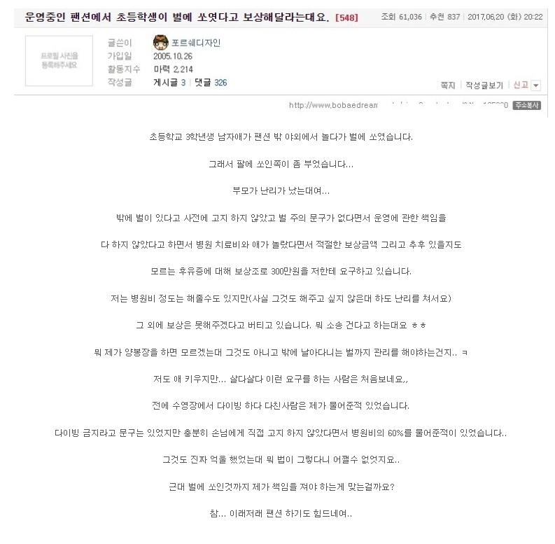| Subject | 운영중인 팬션에서 초등학생이 벌에 쏘엿다고 보상해달라는대요.jpg |
