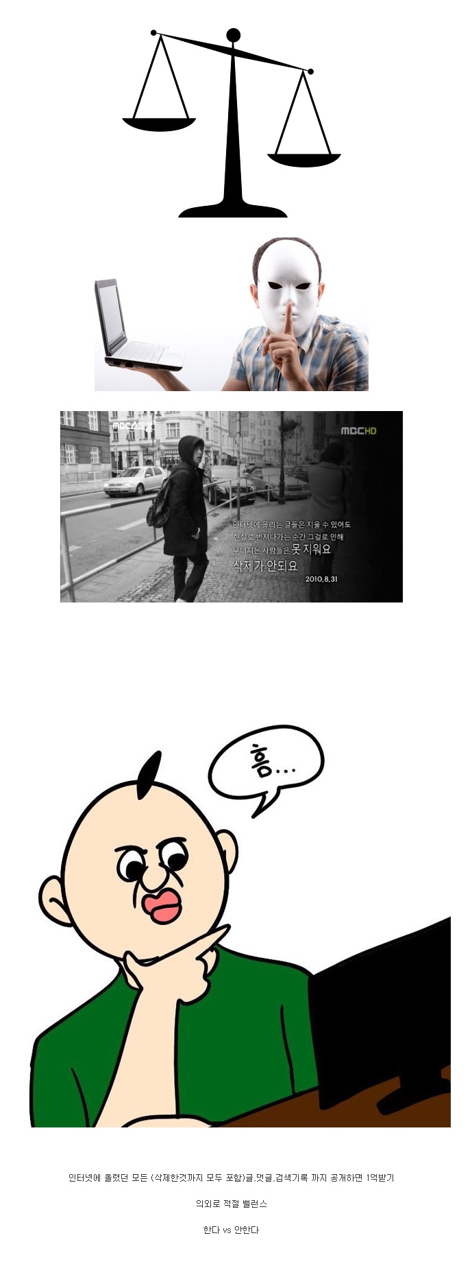 | Subject | [한다 vs 안한다] 자신이 인터넷에 올린 모든 댓글,글,검색기록 공개하면 1억받기.jpg |