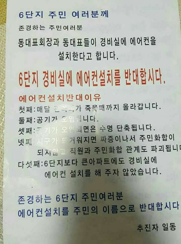 | Subject | 경비실 에어컨 설치에 반대하는 주민들. |