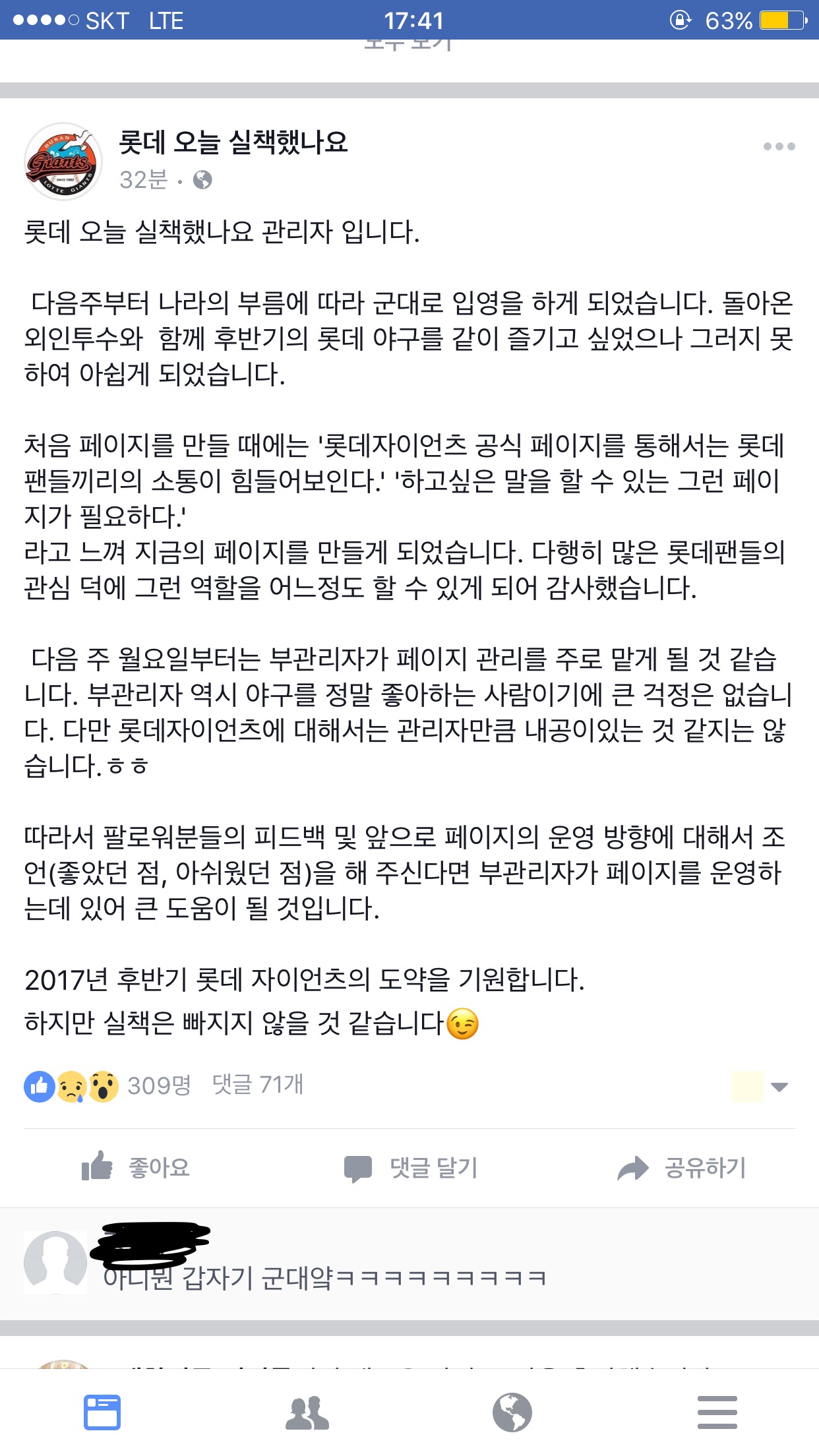 페이스북에서 롯데 팬끼리 롯데의 실책을 주제로 즐겁게 놀고.. 몇 회에 누가 실책을 하냐 맞히기 놀이도 하며... 뭐 그런 공간을 제공해준 페이지 관리자가 군대를 간답니다. 아니 이렇게 어린 분이.... 물론 저보단 나이 많겠죠 0