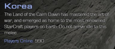 이 조용한 아침의 나라는 전쟁술에 능통하며 전 지구에서 가장 잘 알려진 스타크래프트 플레이어들의 고향입니다. 여기 밀리에 함부로 드나들지 마십시오.