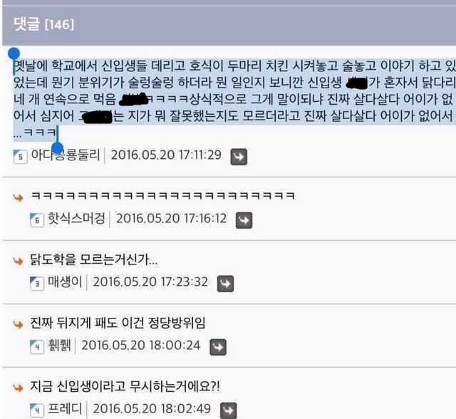 인터넷 썰은 주작이라고 많이 하지만 분명 이런 친구들 많습니다. 과 동아리 후배들 몇 데리고 치킨집에서 맥주한잔 한적 있었습니다. 좀 사는집 늦게 얻은 외아들 후배가 있었습니다. 주문한 치킨 세마리가 나오자 혼자 테이블 옮겨가며 다리만 골라 5개를 먹더군요. 한참 후배라 타박하기 뭐해서 그냥 무시했는데 걔 1년 선배가 그 친구에게 한마디 하더군요. '야. 너만 그렇게 다리 골라 먹으면 어떡하냐?' '전 원래 닭다리만 먹는데요' '다른 사람도 좋아하는데 니가 다 먹으면 다른사람은 못 먹잖아' '그래요? 다들 이야기만 하고 안먹길래 제가 먹었는데요?' '그래도 다른 사람들 몫은 남겨둬야지. 임마' '아직 많이 남아 있잖아요. 그거 먹으면 되죠' .......................................................... 그 순간만큼은 살의를 느꼈다지요. 1