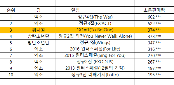 | Subject | 워너원이 역대 초동 3위를 기록했습니다. |