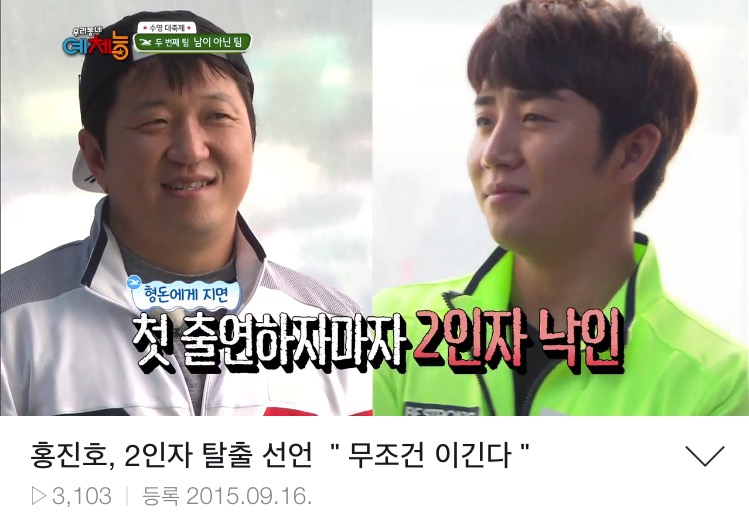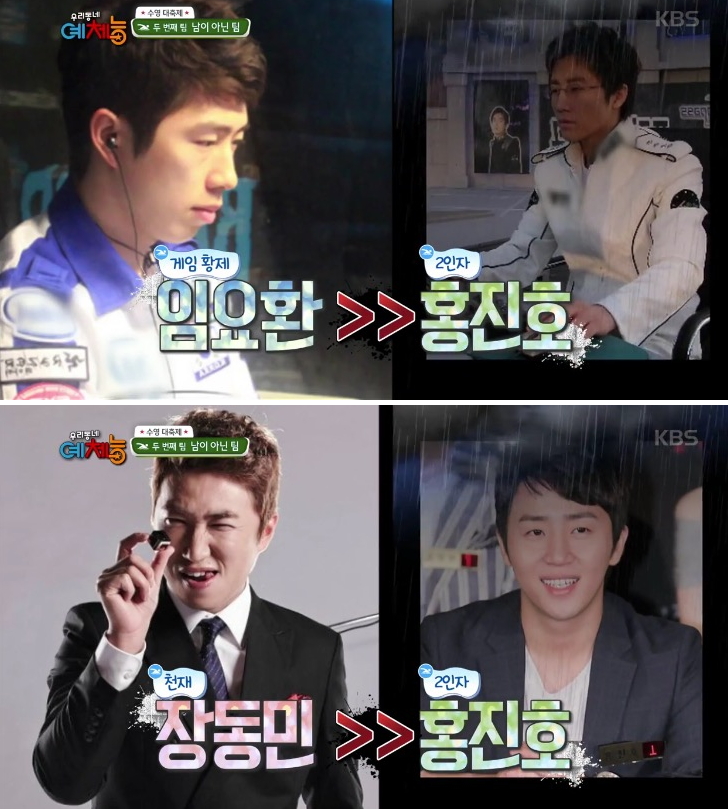 어제 <우리동네 예체능> 에 홍진호 수영 하러 게스트 출연. 정형돈이 홍진호를 보자마자 임요환 - 장동민 에게 밀린 2인자라고 놀리기 시작 하더니, 이번에 수영 에서도 자기 한테 지면 또 2인자가 된다며 계속 놀림. (콩 까지마...ㅠㅠ) 0