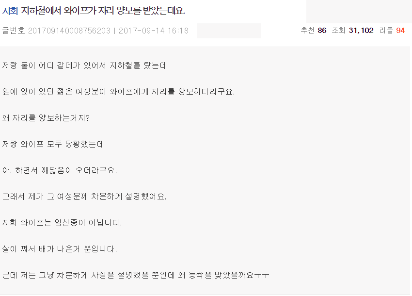 | Subject | 지하철에서 와이프가 자리 양보를 받았는데요. |