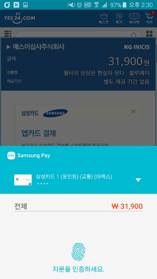 결제과정이 결제방법 삼성페이 선택->지문 결제 끝이랍니다. 공인인증서도 필요없고 비밀번호도 필요없고 저 과정이 끝이라니 덜덜덜...내 살아생전 이런 걸 볼줄이야. 그런데 아직은 삼성카드밖에 안된다네요. 오프라인에서야 와 신기하다 수준이었는데. 온라인 결제가 이정도면 저 노트5 살필요없다라고 한 말 번복하고 낼 사러 갑니다. 0
