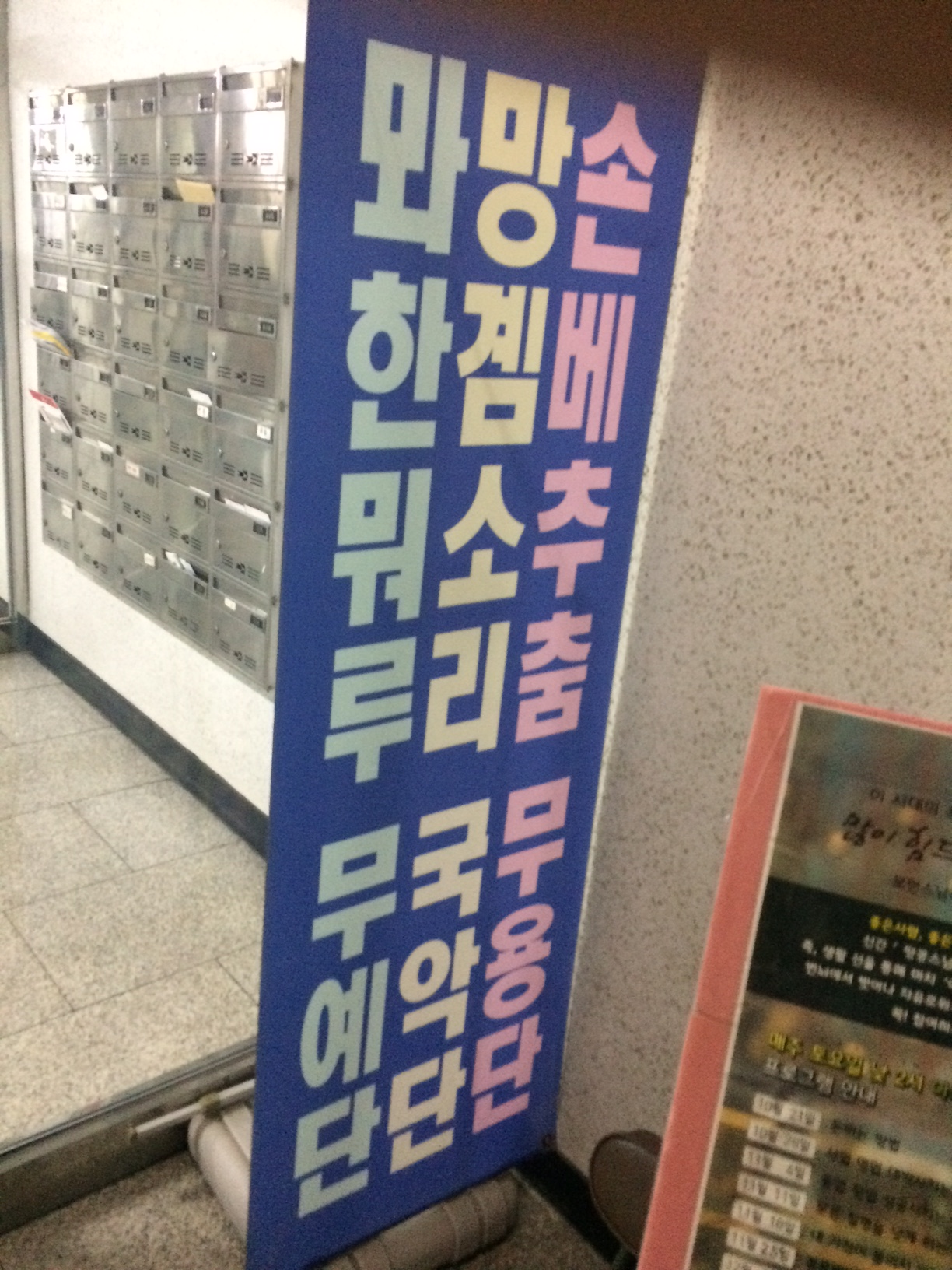 이건.... 뭐지....??? 저녁 약속으로 도착한 건물 입구에 떡허니 서 있는 저 '아햏햏'급에 휘청거렸습니다. 잘못 본 건가, 오타인가, 앞뒤가 바뀌었나.... 등등으로도 정리가 안되더군요. 일단 웃기므로 찰칵. 다음 날 호기심이 동해 네이버링, 구글링을 해 봤습니다. http://sports.chosun.com/news/ntype.htm?id=201608180100181430013799&servicedate=20160817 스포츠조선 기사에 따르면 무려 (재)세계총령무술진흥회 하정효 총령께서 창시한 무술이 '뫄한뭐루'이며, 그분께서는 전통민속동작을 구조로 하는 '손베추춤', 국악입국 운동을 위한 '망곔소리'도 창시하셨다고 합니다. 다른 기사들을 보면 제7회 장한 한국인 상, 2016년 자랑스러운 혁신한국인으로도 선정되셨다네요. 총령님을 제가 몰라뵈었구나.... 아, 뒤늦은 자책을 하며 그분의 얼을 닮고자 좀 더 찾아보았습니다. 민족문화대백과사전에 다음과 같은 서술이 있네요. http://encykorea.aks.ac.kr/Contents/Index?contents_id=E0029762 아아, 총령께서는 한갓 무술 따위가 아니라 '세계정교'를 창시하신 분이셨습니다. 신자가 81만 명이라니..... 나무위키에도 '뫄한뭐루' 항목이 있네요. https://namu.wiki/w/%EB%AB%84%ED%95%9C%EB%AD%90%EB%A3%A8 [8대 1로도 대련이 가능하다고 한다.] 코끝이 시큰해지고 괜한 결기가 나니, 아직 스덕의 피가 흐르나 봅니다. 총령님, 나의 총령님이시여, 감사합니다. 그런데 주석에 pd수첩과의 재판 끝에 승소를 하였고 사과를 받았다는 대목이 나옵니다. 읭? 또다시 찾아보았습니다. 'PD 수첩: 진실의 목격자들'이라는 책에 관련 얘기가 나오네요. https://books.google.co.kr/books?id=3lCYAgAAQBAJ&pg=PT54&lpg=PT54&dq=%EC%B4%9D%EB%A0%B9%EB%B3%B8%EC%A1%B4+%EC%96%B4%EB%94%94%EA%B3%84%EC%8B%AD%EB%8B%88%EA%B9%8C&source=bl&ots=zXp0XYsT86&sig=eYgJz1mbKb1Mjq7Yehtx7KTRkyA&hl=ko&sa=X&ved=0ahUKEwi7xd63s73XAhVBn5QKHeCdBgkQ6AEIKjAB#v=onepage&q=%EC%B4%9D%EB%A0%B9%EB%B3%B8%EC%A1%B4%20%EC%96%B4%EB%94%94%EA%B3%84%EC%8B%AD%EB%8B%88%EA%B9%8C&f=false 98년에 pd수첩에서 보도했네요. [집안의 재앙 운운하며 돈...], [모녀 성폭행]..... 위의 승소 얘기는 반론보도 신청이 받아들여졌다는 거네요. [이제 알 만한 사람들은 반론보도로 이해하지만 종교시설일수록 정정보도로 강변하며 신자들을 미혹하는 거다.] 그만 찾아보자. 1