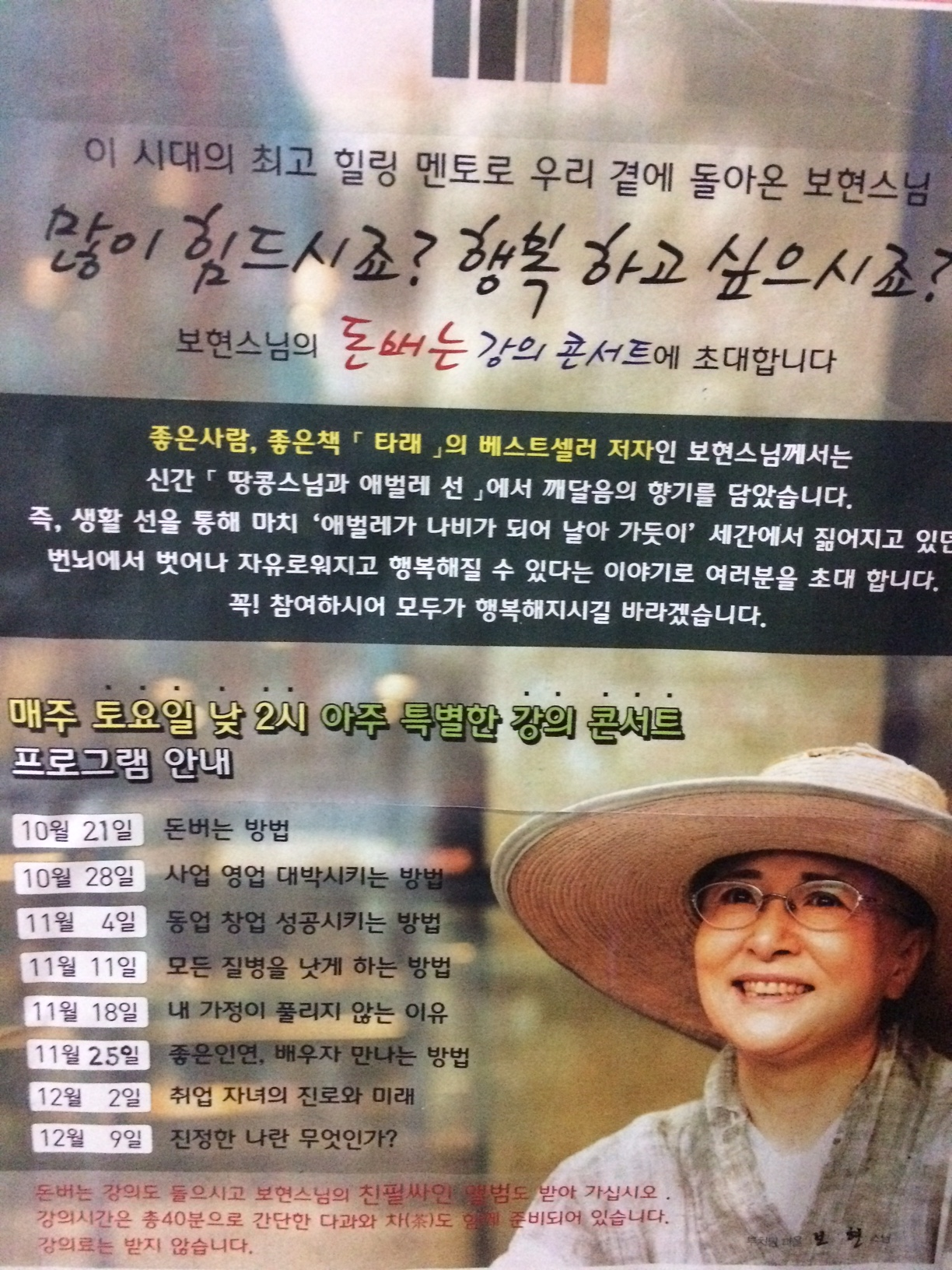 아래 진리의 본산 1 사진 바로 옆에 있는 포스터입니다. 같은 건물이라는 얘기죠. 참고로 보현스님은 84년에 이선희와 함께 KBS 가요대상 신인가수부문 후보에도 오른 가수 이경미라고 합니다. 87년에 드라마 사모곡의 주제가를 부른 것으로도 유명하네요. https://youtu.be/qV3AWDhlq0M 0