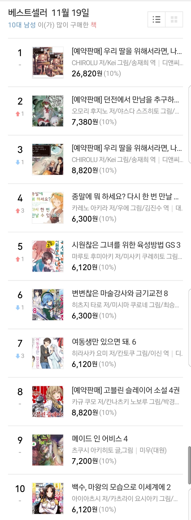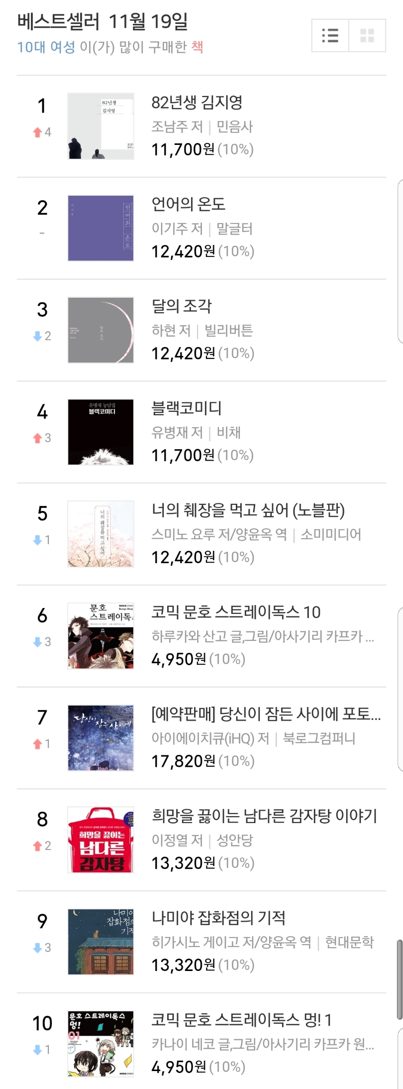 한국 10대 여성 - 1위 : 페미니즘 - 2위 : 자기계발서 - 3위 : 수필 - 4위 : 풍자 - 5위 : 씹ㅡ뜨억 - 6위 : 씹ㅡ뜨억 - 7위 : 드라마 서적화 - 8위 : 자기계발서 - 9위 : 장르문학 - 10위 : 씹ㅡ뜨억 한국 10대 남성 - 1위 : 씹ㅡ뜨억 - 2위 : 씹ㅡ뜨억 - 3위 : 씹ㅡ뜨억 - 4위 : 씹ㅡ뜨억 - 5위 : 씹ㅡ뜨억 - 6위 : 씹ㅡ뜨억 - 7위 : 씹ㅡ뜨억 - 8위 : 씹ㅡ뜨억 - 9위 : 씹ㅡ뜨억 - 10위 : 씹ㅡ뜨억 -- 10대 남성 중 덕들은 많아야 1/10도 안될 거라는 점을 감안한다면 이맘때의 남자 아이들은 사실상 책을 안읽는다고 보는 게 맞겠죠? 1