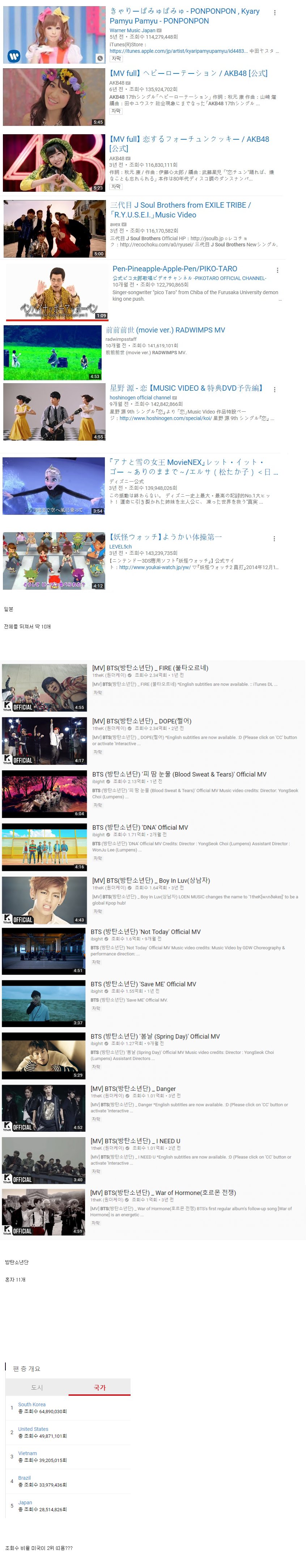 유튜브 조회수 1억이상 영상, BTS vs 일본 입니다. 물론 일본은 자체 플랫폼인 니코동으로 분산되는 성향이 있습니다 ㅋ 0