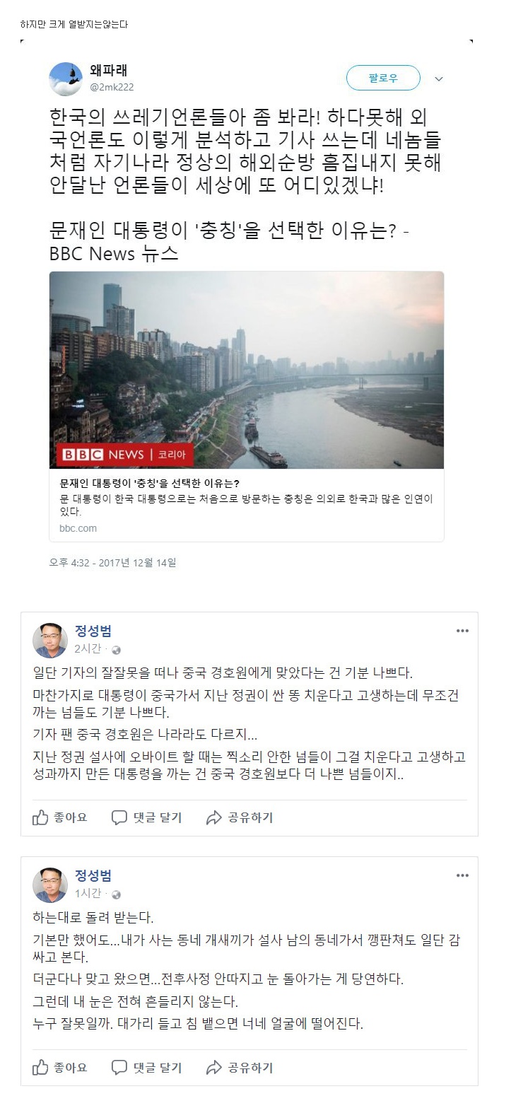 우리 나라 사람이 맞고 오니 기분은 나쁘다 0