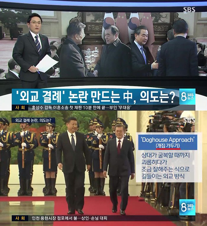 방송에서 SBS가 근거로 든 두가지. 차관보가 영접나옴, 왕이 외교장관이 문재인 대통령 악수하며 팔 툭툭 침 = 차관이 공석이라 차관보가 나온 것, 왕이는 푸틴이나 트럼프한테도 팍 툭툭 작년 촛불때 조금 달라지나 싶더만.. 아이구... 0