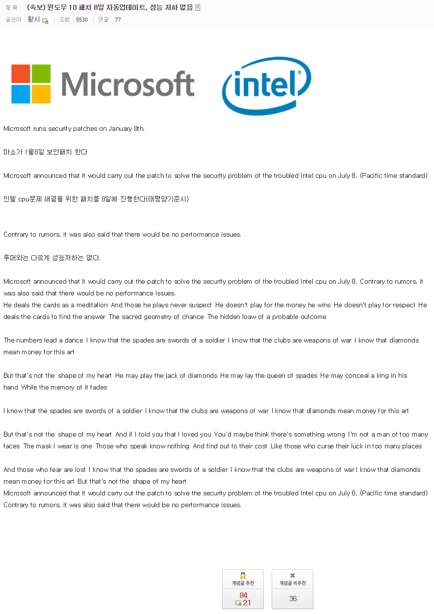 | Subject | 인텔 cpu 사태, 8일 성능저하 없는 패치 예정 |