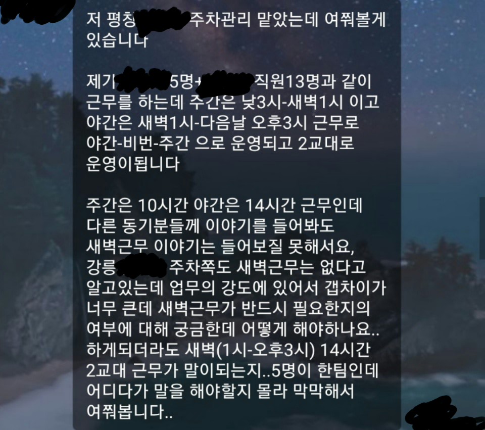 출처 동의 후에올립니다. 와ㅋㅋㅋㅋ주야 2교대에 주비야비 굴리는건 어지간한 악덕아웃소싱급인데ㅋㅋㅋㅋㅋ진짜ㅋㅋㅋㅋ저거 돈도 다 지급안할거에요 아마..근로기준법상 노동자가아니라서.. 엊그제 그밥주고 그지같은숙소에서 이렇게 굴리면서 뭔.. 0