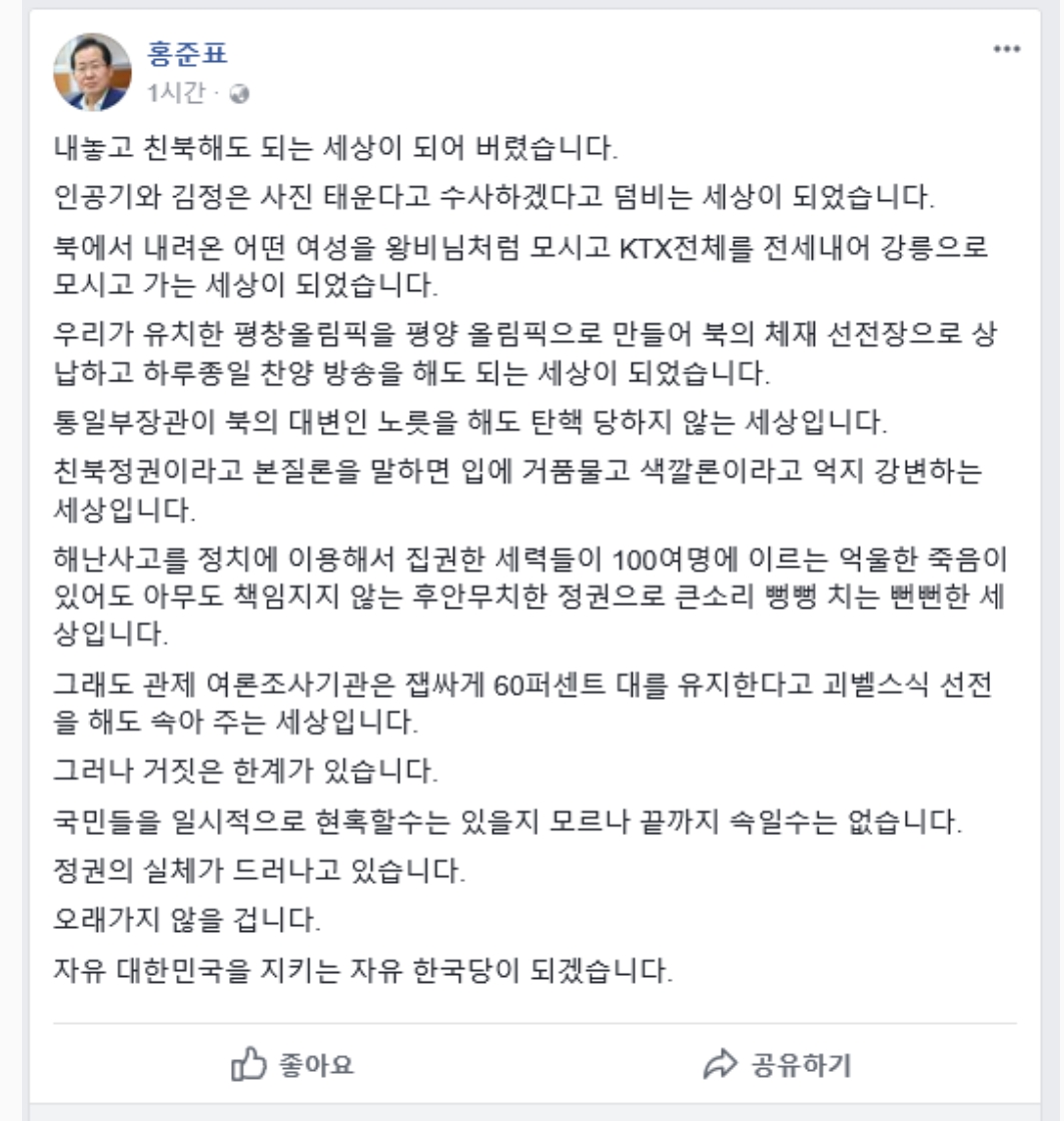 Subject   정부와 여당 지지율을 위해 애쓰는 홍준표