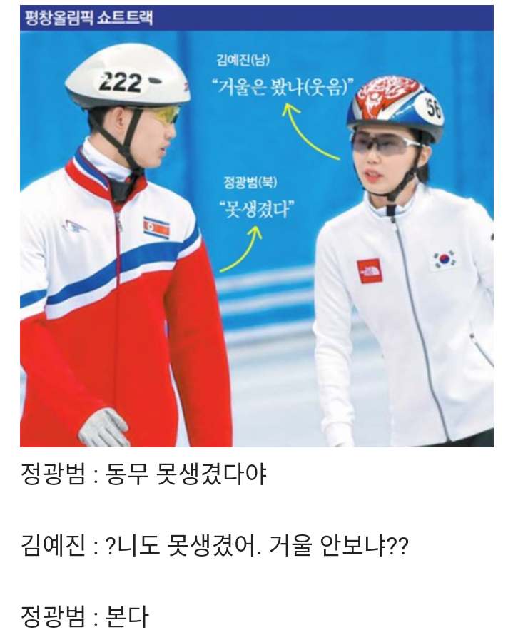 [올림픽] 남북막내 아옹다옹…정광범 "너 못생겼어" 김예진 "거울봐봐" http://v.sports.media.daum.net/v/20180208191758953 "나보고 못 생겼하고 하더라"라며 깔깔 웃었다. 그는 "너도 못생겼다고 응수해줬다. 거울은 보냐고도 했다. 본다고 하더라"라고 말했다. 정광범은 올림픽 기간 내내 국내 취재진 앞에서 입을 꾹 다물고 있다. 그러나 말이 통하는 또래 친구를 만나자 허물없이 장난치며 어울렸다. ㅋㅋㅋㅋㅋㅋㅋㅋㅋㅋ 두 선수 다 너무 귀엽네요 4