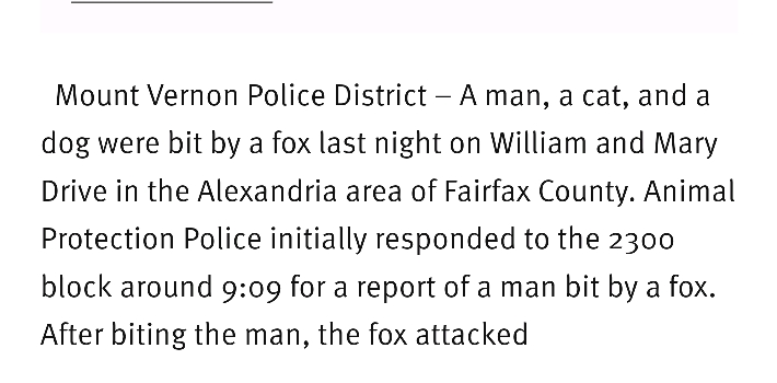 실제 오늘자 뉴스랍니다. 미국 와싱턴주 시애틀 한참 위에 있는 마운틴 버논 동네이야긴데요. .. 남자 한 명, 고양이 한 마리, 개 한마리가 여우에게 물렸습니다. 아...어떤 상황인지 모르겠지만.... 첫문장이 의미 심장해보였어요. 0
