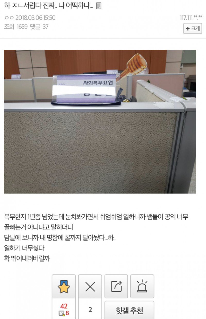 현역나오신 분들이야 공익이 좀 저런 대우 받으면 어때 싶긴 하지만 대놓고 조롱하는것마냥 좀.. 사실 사회복무요원으로 쓰이는 공익들은 신분 특성상 업무에 대한 책임을 제대로 질 수 있는 위치가 아니라서 엄격하게 따지면 할 수 있는 업무가 한정적이다보니 직원들이 배째라 식으로 업무를 떠넘기지 않으면 행정보조같은 업무들은 기관따라선 꽤 한가하기도 하죠. 복지원이나 설비,환경유지 관련 같은 직무에비해서는 특히 더.. 그래도 그렇지 이름표에 저렇게.. 1