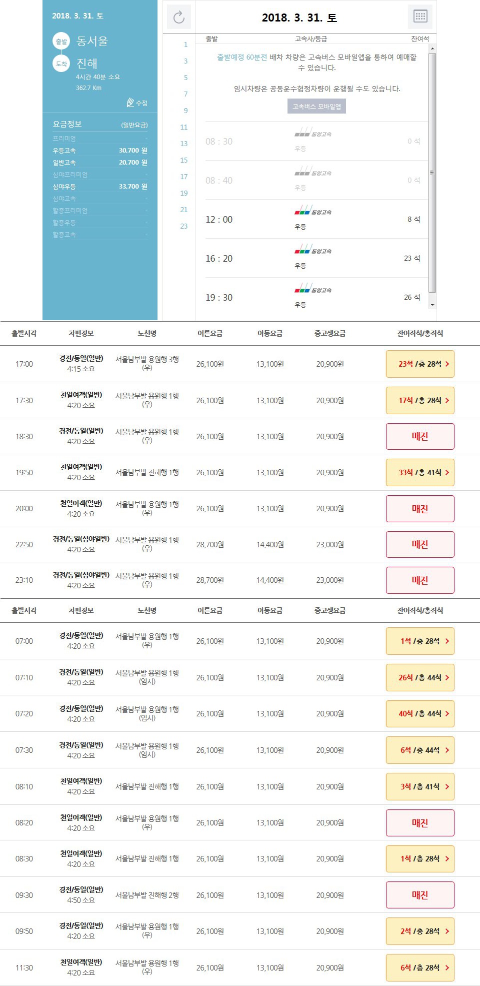 상 - 동서울 ~ 진해 31일 중 - 남부터미널 ~ 진해 30일 야간 하 - 남부터미널 ~ 진해 31일 주간 금요일 야간 버스까지 벌써 매진이 나오는 현실... ㄷㄷㄷ 0