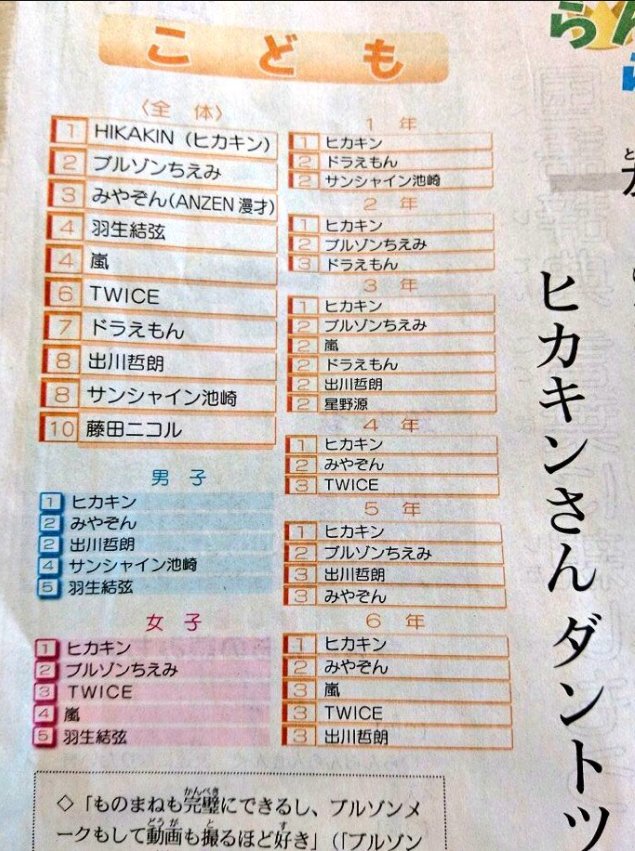전체 6위 여자 3위 4.6학년 3위 1위는 유튜버 히카킨 ------------------------------------------------------------------------ 갈라파고스라하는 일본마저 유튜브가 지배를...(사실잘 모름;;) 저기 보이는게 아라시는 아니겠지...? 0