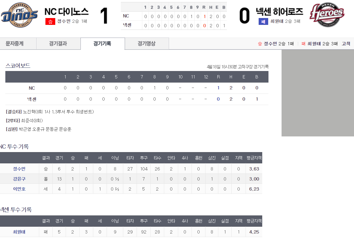 퍼펙트가 깨졌음에도 멘탈 안나가고 잘 던졌는데 넥센 타선이 정수민(8이닝 무실점)에게 꽁꽁 묶이는 바람에 결국 완투패를 해버렸네요.