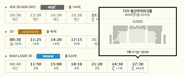 27:30(03:30) 시작... 30:09(06:09) 종료... 이미 목 좋은 자리들은 팔렸음... 진짜 천만은 기본이 될듯... 영사 기계가 뻗으면 안되는데 저렇게 돌리다니... ㄷㄷㄷ ps.경상도 어느 지역의 상영관 내일 시간표 덤으로 첨부... 0