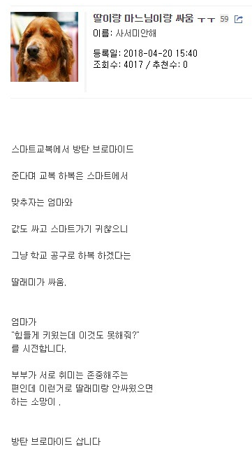 | Subject | 딸이랑 부인이랑 교복때문에 싸움 ㅜㅜ |