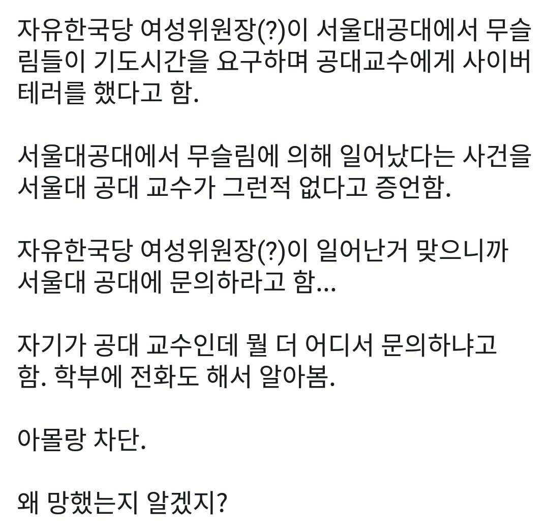| Subject | 서울대공대에서 무슬림학생이 기도시간을 요구하여.. |