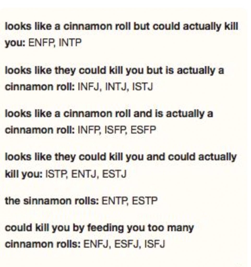 시나몬롤처럼 보이지만 널 죽일 수 있음 ENFP INTP 널 죽일 수 있을것처럼 보이지만 시나몬롤임 INFJ INTJ ISTJ 시나몬롤처럼 보이고 시나몬롤임 INFP ISFP ESFP 널 죽일 수 있을 것처럼 보이고 널 죽일 수 있음 ISTP ENTJ ESTJ 시나몬롤임 ENTP ESTP 네가 죽을때까지 시나몬롤을 쳐먹일거임 ENFJ ESFJ ISFJ 시나몬롤: 영미권 덕후계 밈으로 순수하고 무해한 그런 캐릭터를 뜻합니다 0